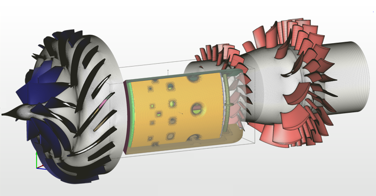 For blade-like geometries, users can apply a structured approach, and for non-rotating parts, like combustion chambers, volutes, etc, users can apply an unstructured approach, both available in Automesh (the unstructured module was previously known as Hexpress). As an example, a complete turbomachine is shown below (the complete simulation is detailed here). Each piece can be done separately, and the mesh generation itself in parallel. As such, 19 minutes are necessary if we can afford to run them at the same time.