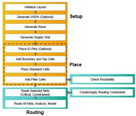 • Setup, check, supply, route, results: Configure routing, run checks, route power and signal nets, and analyze results.