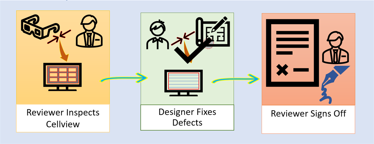 The reviewer initiates a specific review by using a checklist that can be suitable for certain designs or customers. The reviewers create defect markers in a design to identify the spots for fixes.