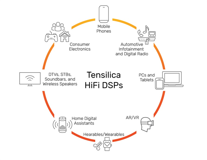 Cadence Tensilica HiFi DSP 用途广泛,从支持永远在线功能的低功耗系统到面向可听戴设备、可穿戴设备、家庭娱乐和车载娱乐的高性能系统,各种系统皆可轻松应对。除了传统的 DSP 工作负载外,Tensilica HiFi DSP 也越来越多地用于唤醒词检测、音频场景检测、语音识别和降噪等机器学习应用。