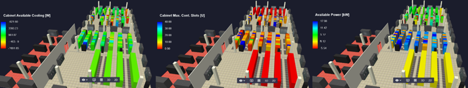 Image and relative results of capacity availability for a data center in operations—considering cooling, space, and power—generated using Cadence Reality DC Digital Twin