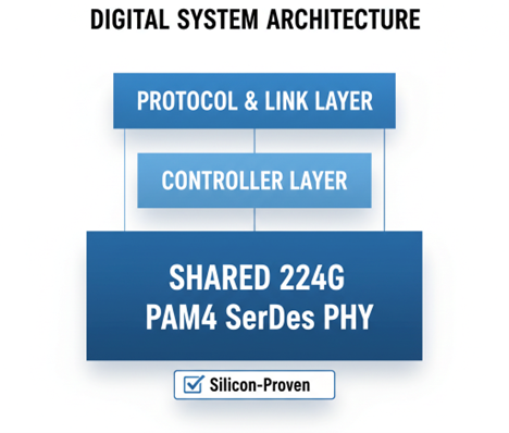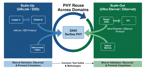 At the physical layer, the emergence of a silicon-proven 224G PAM4 SerDes has become a unifying foundation for both scale-up and scale-out transports. By leveraging the same high-speed SerDes for UALink-based fabrics and Ethernet-based scale-out networks, teams can reuse validated silicon, streamline validation cycles, and accelerate time to tapeout. This convergence is already shaping leading AI and hyperscale designs, with the 224G SerDes serving as a common PHY foundation across diverse interconnect fabrics and protocols