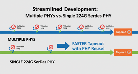 On the scale-out side, Ethernet continues to evolve to meet AI bandwidth demands, with 800G and 1.6T systems pushing both electrical and optical boundaries. Despite these advancements, the value of reusing a validated 224G SerDes PHY remains constant.