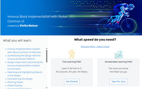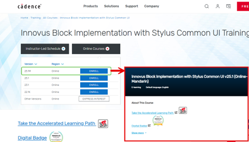 You can also enroll in it by going to the site (ask.cadence.com) – Select Learning – Choose Online Courses – choose the Innovus Block Implementation with Stylus Common UI v25.1 (Online -Mandarin).