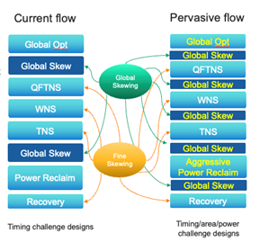 • Instead of end‑stage skewing, the Innovus Implementation System applies pervasive global skew throughout the flow to maximize useful skew, reduce upfront power, and create margin for power reclaim while minimizing timing churn.