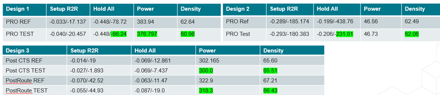• New hold optimizer improves hold TNS, area, and power, and provides an extra performance boost, automatically improving QoR. Its benefit is clear from the designs considered below: