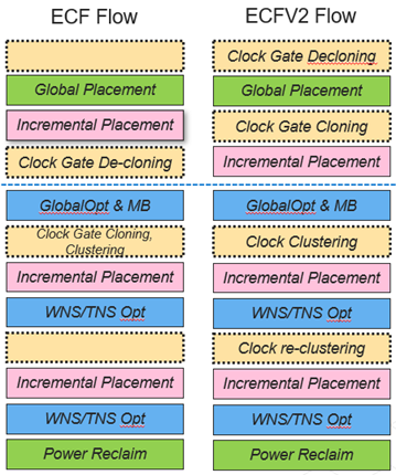 Early Clock Flow (ECF) V2: ECFV2 improves upon the original ECF by addressing issues such as de-cloning after placement and a lack of timing awareness. It moves de-cloning before placement and adds physical awareness to better guide incremental placement. Additionally, ECFV2 enhances clock clustering and de-clustering for improved clock correlation.
