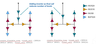 create_flexible_tree –trunk_cell {INVX24 INVX16 INVX8} –final_cell {BUFX24 INVX24}