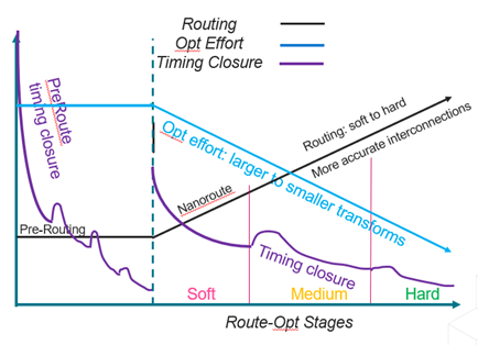 The new PRO addresses this by moving from soft wires and global routes with dRoute-level accuracy (eDR) to hard wires (final detailed routes), letting the optimizer try bigger, smarter changes while seeing near-final parasitics. Concretely, it runs through four stages: