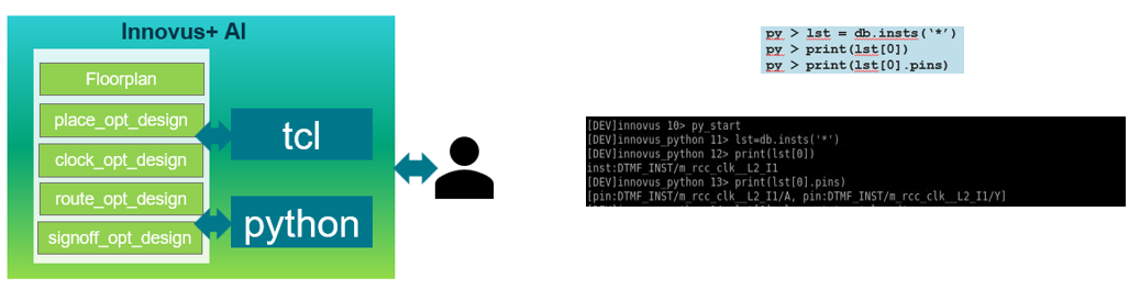 For usability and data science workflows, Innovus Implementation System embeds a Python UI so you can call Python AI libraries directly on the live database (and connect to JedAI) to mine instances/pins, prototype heuristics, and operationalize learned policies inside the flow.