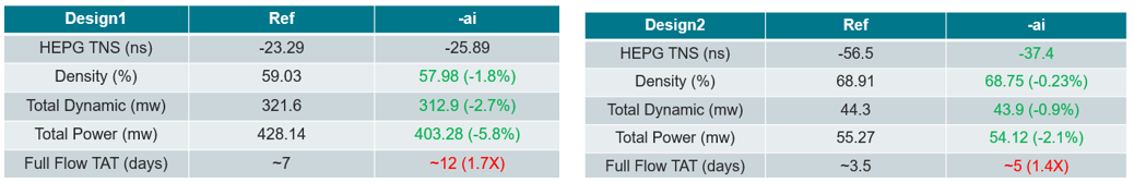 On recent customer designs (25.12), -ai runs demonstrated reduced density and total/dynamic power at the cost of longer exploratory TAT, which typically shrinks as recipes stabilize.