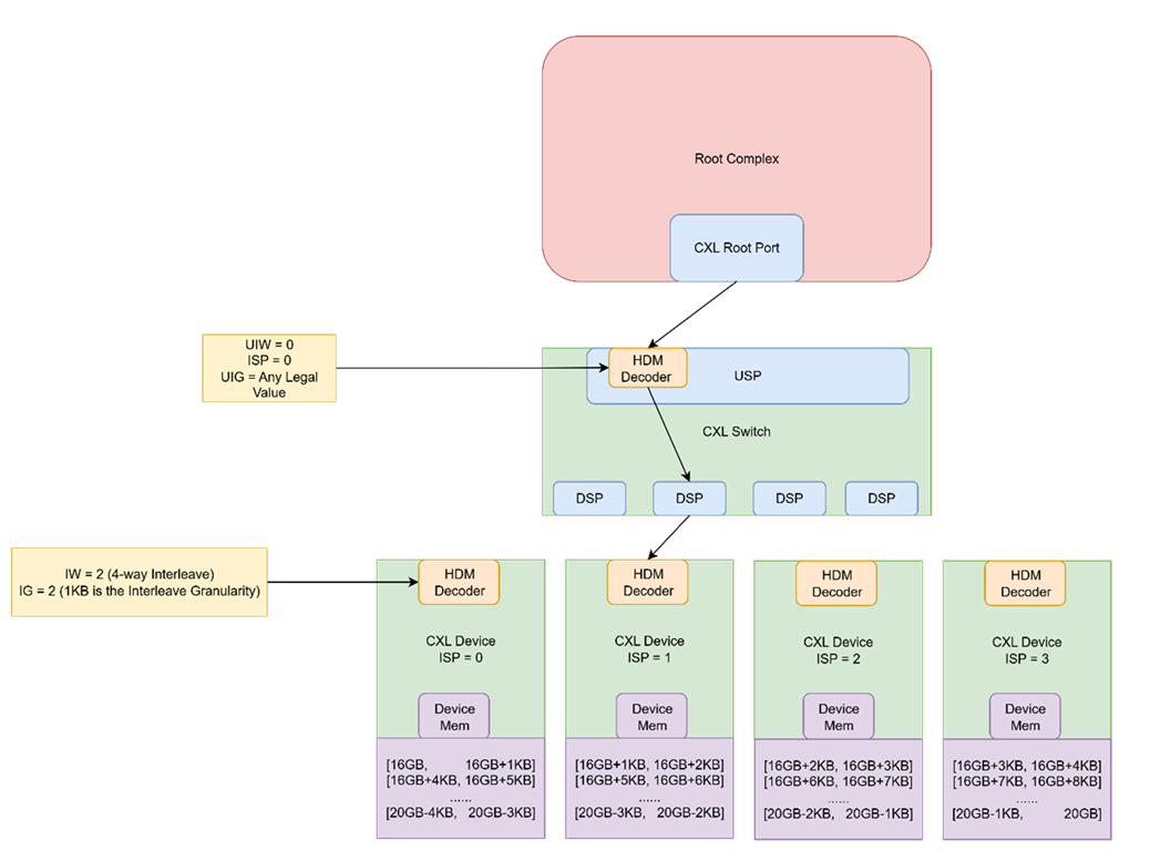 The following illustrates a simple memory fan-out topology with four memory devices behind a CXL switch. HDM decoder in each device, as well as the upstream switch port, is configured to decode the HPA range 16 GB to 20 GB, at 1-KB granularity. The leftmost device receives 1-KB ranges starting with HPAs 16 GB, 16 GB + 4 KB, 16 GB + 8 KB, …, 20 GB – 4 KB (every 4th Chunk). The root complex does not participate in the interleaving process.