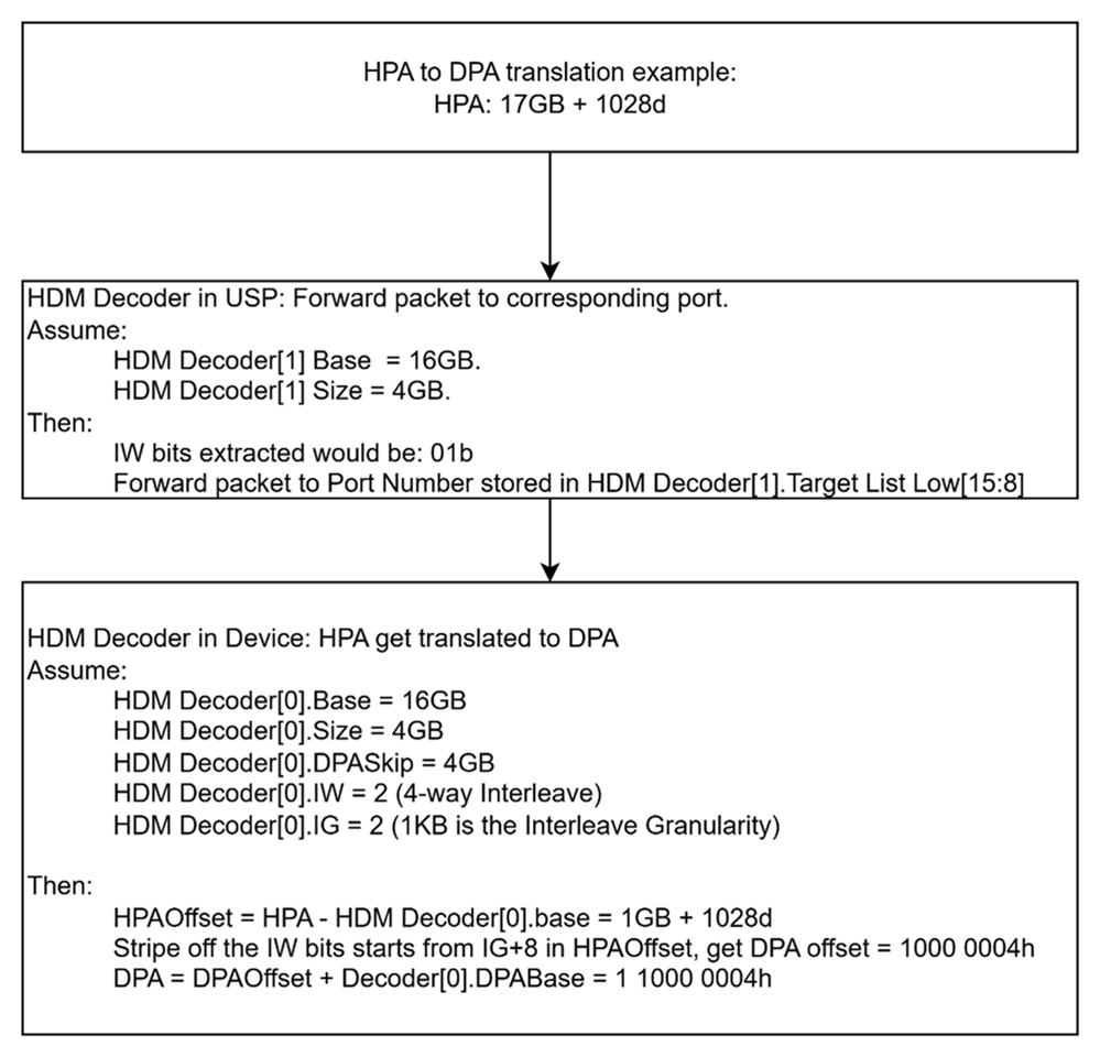 Let’s use the above topology as an example and perform one HPA to DPA translation on one CXL.mem TL packet.