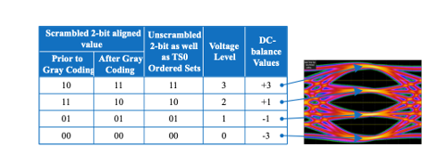 Figure: PAM4 signaling at UI level: Voltage levels, 2-bit encoding, and their corresponding DC balance values