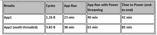 App2: A multi-threaded, 3.83 billion-cycle application's full power analysis was completed in 85 minutes.