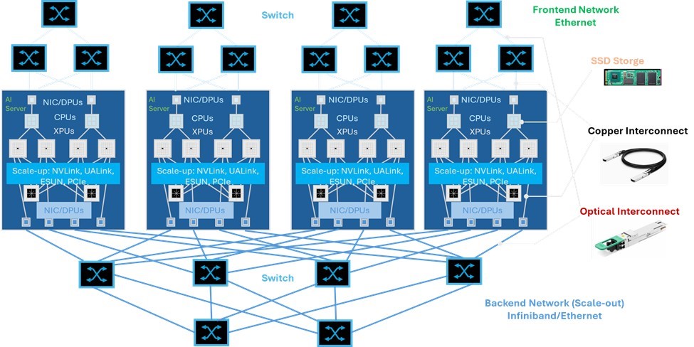 AI data centers use a mix of copper and optical connectivity. Copper is typically used within a tray and inside a single rack, while optics serve the inter-rack domain where distances and bandwidth demands escalate. These optical interconnects make it possible to link thousands of GPUs into a single cluster and then to aggregate multiple clusters into systems containing tens of thousands of GPUs.