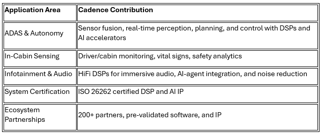 Cadence’s strong ecosystem of over 200 partners ensures seamless integration of DSP technologies into automotive designs, reducing time-to-market and enhancing end-user satisfaction. The table below highlights Cadence’s DSP and AI Solutions in automotive.