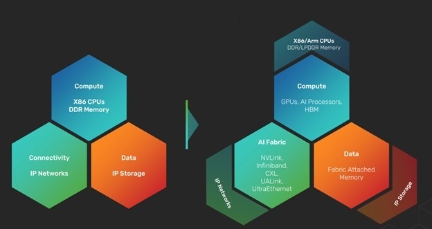 Traditionally, computing systems relied heavily on x86-based CPUs with standard internet protocols for connectivity and legacy DDR memory modules. However, as AI workloads ramp up, we see a fundamental shift toward heterogeneous architectures. Modern systems pair CPUs with accelerators like GPUs, AI processors, and data processing units (DPUs), using advanced memory technologies such as high-bandwidth memory (HBM) or GDDR for optimal performance. This diversification in hardware demands evolving connectivity standards, including NVLink™, InfiniBand, CXL™, and Ultra Ethernet™, to meet the data-intensive needs of AI applications. These advancements signify a move beyond traditional computing paradigms, adding a new layer of performance-optimized connectivity and storage to handle AI-specific workloads.