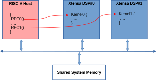 Xtensa SDK also includes a library loader. RPC can be combined with the library loader to dynamically load kernels onto DSPs. Kernel0 and Kernel1 in Figure 3 can be loaded by the host application before execution. The DSP kernel is pre-compiled as a position-independent library.