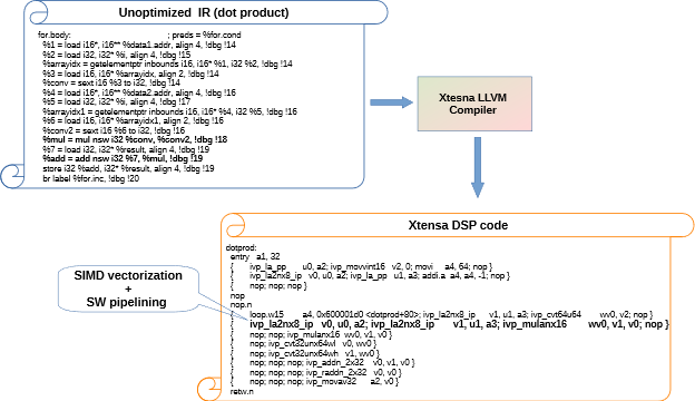 Application developers can specify DSP code in their preferred programming language. Xtensa LLVM-based tools consume unoptimized intermediate representation (IR) to generate optimized machine code, as shown in Figure 4.