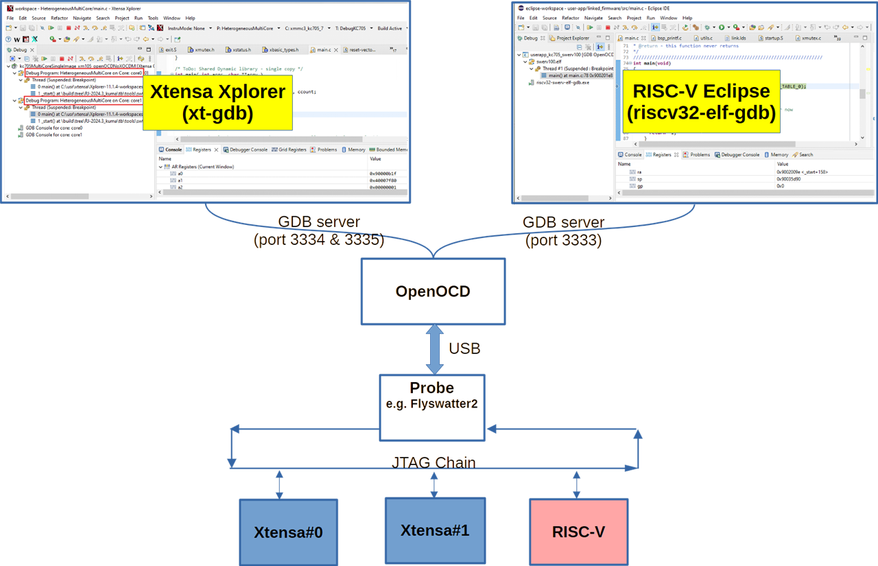 Figure 6 illustrates a debug scheme. OpenOCD connects to the target cores via the JTAG probe. RISC-V and Xtensa GDB instances connect to their respective target cores via OpenOCD GDB server ports. Both the RISC-V and Xtensa IDEs provide standard source-level debugging. Each core can be reset independently. Synchronous debugging is supported. Note that two Xtensa DSP debug contexts are annotated in red in Figure 6.