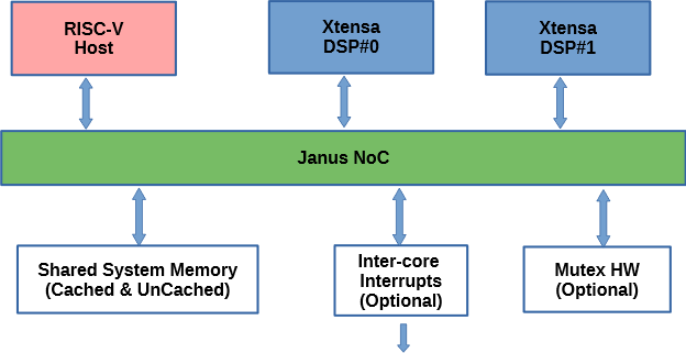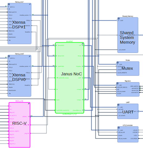 Figure 1 depicts a sample architecture with one RISC-V core and two Xtensa DSPs. A configurable Janus NoC connects all the system components.