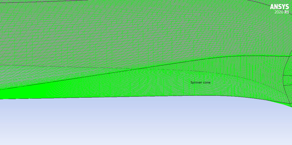 You can see that the streamwise expansion ration of the line on the Spinner Cone (Hub) is higher compared to the meridonal lines in the channel. Due to that the channel lines make that high curvature when getting closer to the Hub curve.