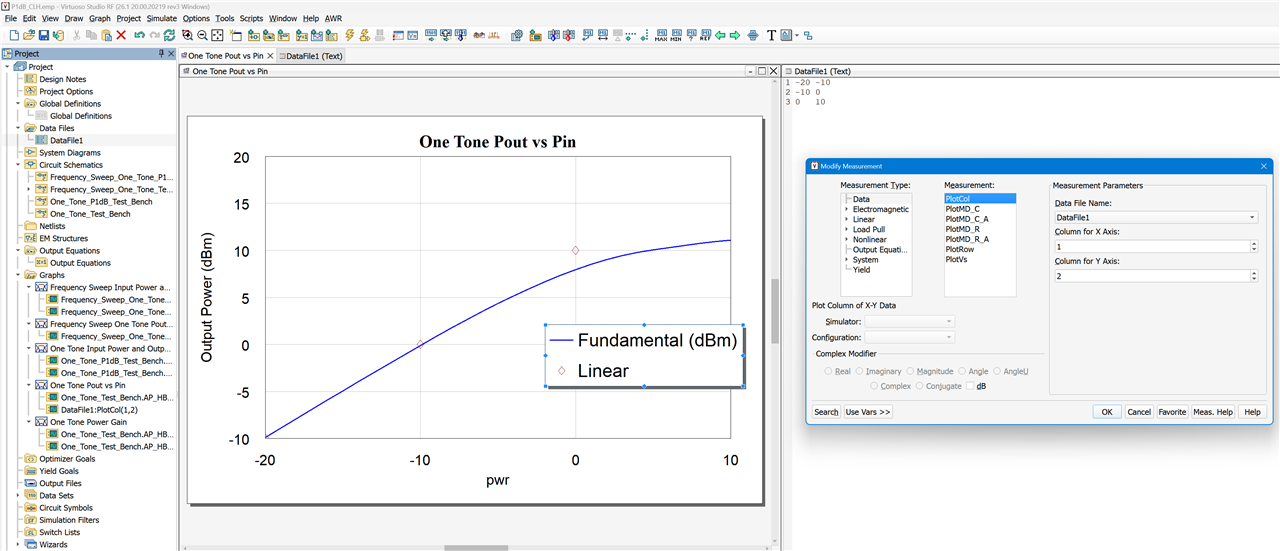 Perhaps there is another way to achieve what I want. I want to create a P1dB graph, output power as a function of input power with a line interpolated from the linear region of the curve and a marking for the 1dB compression point. Currently I have used output equations for the interpolation and then included that in the graph. The line is then included in the legend but I would prefer it wasn't (secondary issue is the inclusion of a singel point at P1dB, see my other post). I would include a screenshot to make it clearer but it seems I can't insert images. "An error occurred. Please try again or contact your administrator".