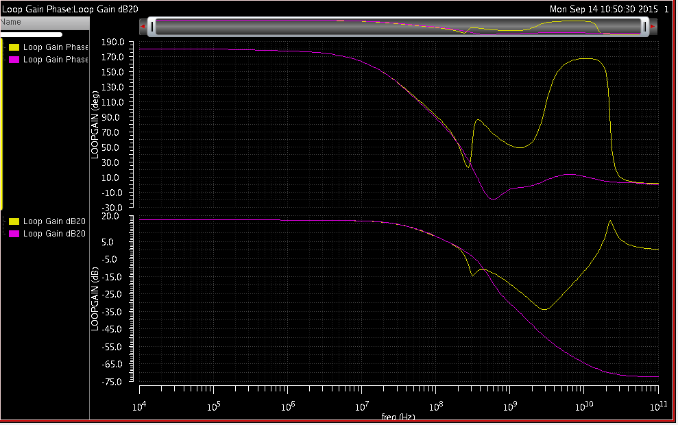 I am trying to simulate the stability of an LDO with respect to a local ground on chip. I use a 0V voltage source to break the feedback loop and get fairly normal looking results when I include bondwire inductance on the vcc input line only and local decoupling caps (purple lines in attached plot). When I include bond wire inductance (~ 2nH) on the gnd line though I get very strange results, mainly very significant gain and phase peaking at high frequencies (> 1GHz).  It appears that stb analysis runs with respect to the global gnd! Is there a way to use a probe to run stb wrt to the local gnd? Is it possible to use diffstbprobe for this purpose?  The help file mentions a "localgnd" parameter but I cannot figure out how to add the parameter.