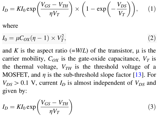 Id = u*Cox*(Vt^2)*(W/L)*exp( (VGS-Vth) / m*Vt ) * [1 - exp(-VDS/VT)]
