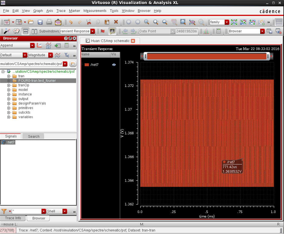 When simulation end, I open psf file to plot signal. It is clear that there is the desired signal in fourier analysis folder but this signal has nothing, when I plot there is nothing in it.
