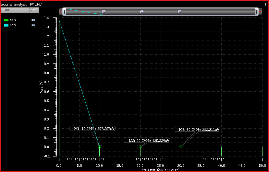 I attached the picture below with about the result but net7 contains no data. The waveform shown is from transient analysis not fourier.