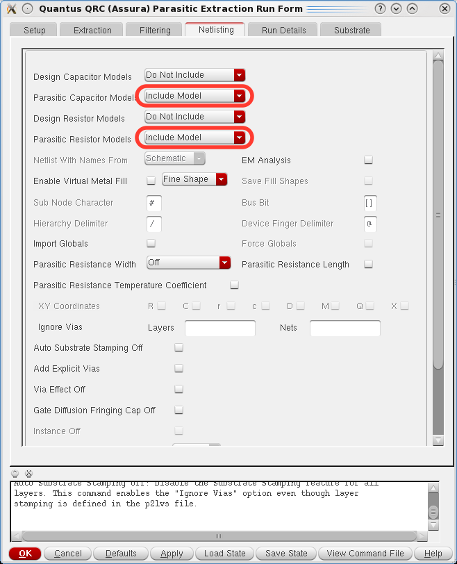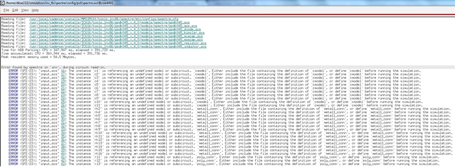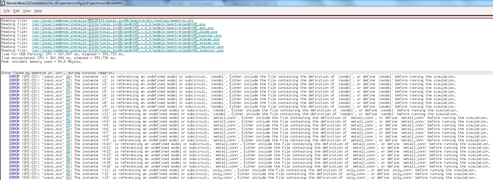 I am trying to run Post Layout Simualtion for a NOT gate after extracting parasitic capacitances and resistances. The NOT gate was designed using gpdk 45nm technology file.  The RC extraction was done using Assura QRC. Below are the errors while trying to run post layout simulation.