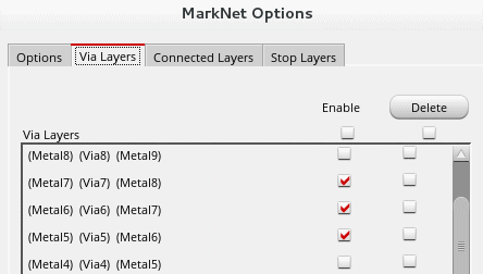 Lets say I have 10 metal process. I want to trace certain net from metal 5 to metal 8.  How do I use MarkNet Options, like what should be selected in Via layers, Connected layer, Stop layer ? I was giving metal 8 in stop layer but it didn't work. Can someone point to me to material that talk about right usage of stop layers. I am using ICADV12.1