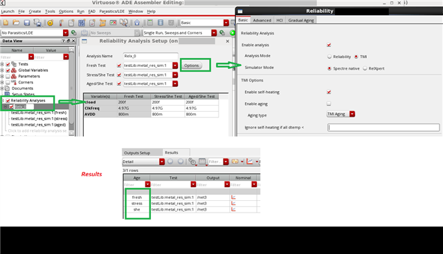 In Simulation > Reliability > Setup,  TMI analysis mode is enabled. Simulator mode: Spectre native, Enabled self-heating, Enable aging, Aging type: TMI Aging.