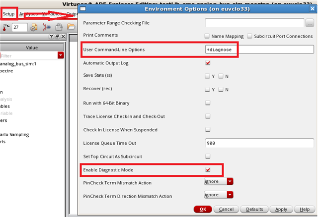 The setup button is in ADE. I don't know which IC version you are using, so you can add the user command-line option '+diagnose' yourself if you don't see the option to Enable Diagnostic Mode. But this option may not work with MMSIM121 as this version is very very old, but you can give it a try.