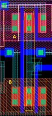 So basically, the weak connection appears when I make the (circled) metal connection between the abutted contact points. These 4 transistors just form 2 transmission gates as shown in the schematic below where the metal wire connects sources of NMOSes and drains of PMOSes :