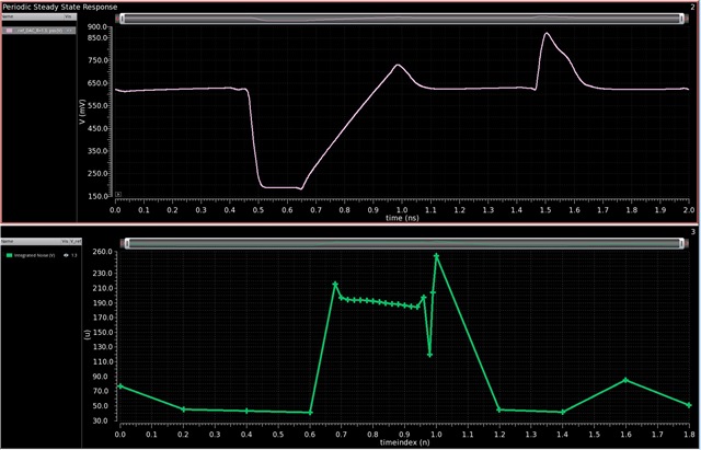 1) Why the x-axis of the integrated output noise is called "timeindex" and not time? And why it stops at 1.8n, while the pss stops at 2n?