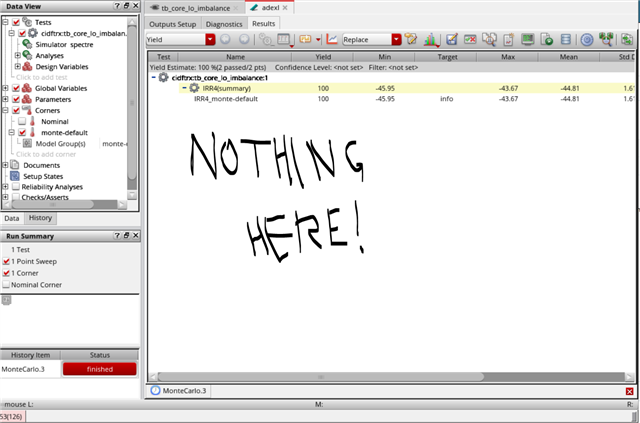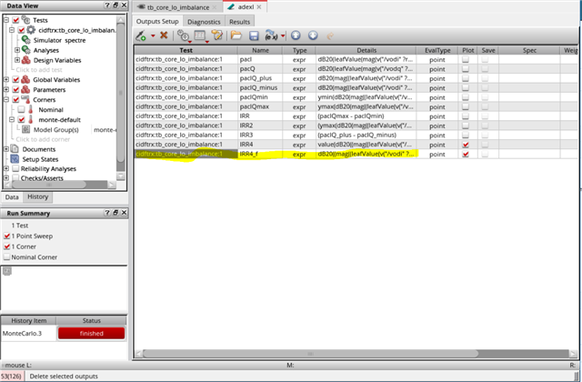 I have to use ADE XL for that (ADE doesn't work) and I am confident I am doing everything right: I enabled the Monte Carlo corner, have an output "IRR4" at 100 kHz and "IRR4_f" which would give me a curve vs frequency in a normal ADE simulation. I hit Run -> Monte Carlo Sampling and make sure I have selected [x] Save data to allow family plots.