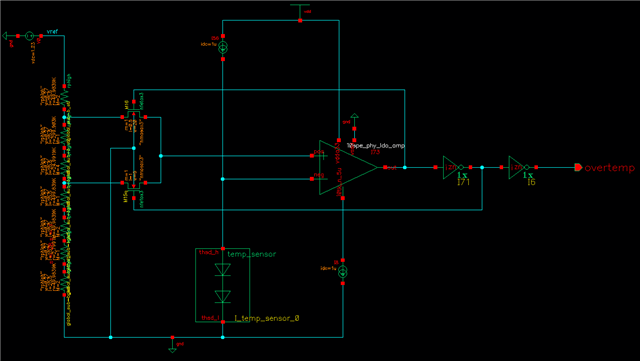 From the schematic, you can see that, a resistors divided reference voltage compares with a negative temperature coefficient voltage, then following after two invertors to get overtempt.