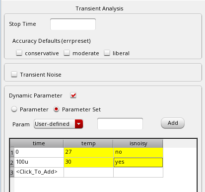 Be aware though - making too large a step in the temperature within a transient is likely to lead to convergence problems as otherwise you've introduced a sudden discontinuity. You can take advantage of the "param_step" option (see "spectre -h tran" on the UNIX command line for more details) to break down the step into smaller pieces (param_step is the time-step between each discrete change). That does still have to be entered via the additional parameters field.