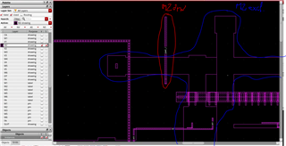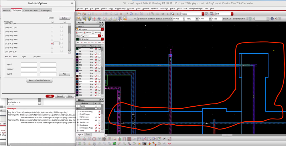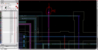 In this example for the test I try to highlight a simple net (that does not propagates too much in the layout) called "pwr_i", here in metal 2 (purple).