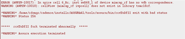 You appear to be using Assura RCX which hasn't been supported for many years. It would be better to use Quantus QRC (with Assura). Not sure if that's the issue - but it is complaining that a particular device doesn't have correspondence - so was it actually LVS clean?