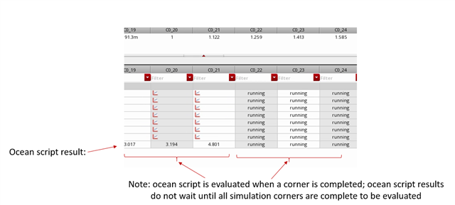 I just did an experiment with a smaller circuit and ran it over corners with a simulation stop time that is dependent on a variable in the set of corner simulations. I used an ocean script that computes the time of the simulation and reports it as an output for each corner. I found that the ocean script is evaluated after each individual corner is completed. Figure 1 shows the outputs tab of the Assembler session showing the ocean script result for completed corners while additional corners are still in their simulation phase.