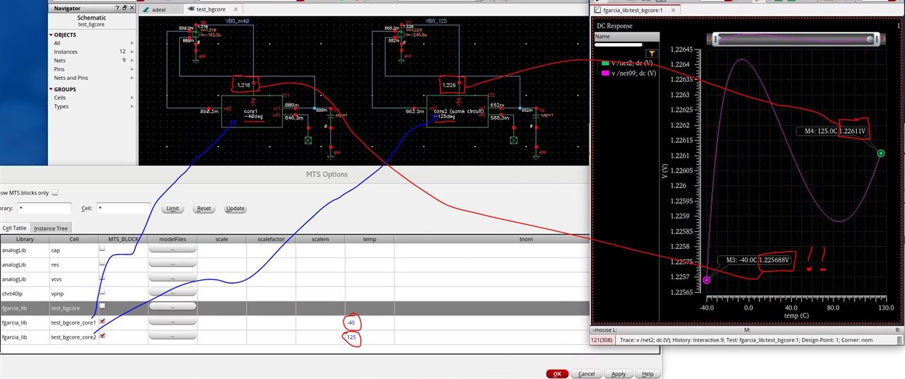 Here I am simulating a bandgap core voltage vs. temp, so I set one cell to -40deg and the other to 125deg, but the values (especially at -40deg) looks wrong compared to the temperature DC sweep simulation (or even to the DC operating point at -40deg without MTS that matches the value from DC sweep).