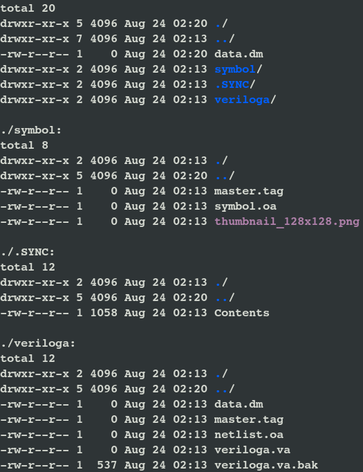 You didn't include the "R". I need the R in "ls -alR" to descend into each of the veriloga and symbol directories, otherwise I won't be able to see why it doesn't show the contents. So that you don't have to blank out the user name, simply using this instead: