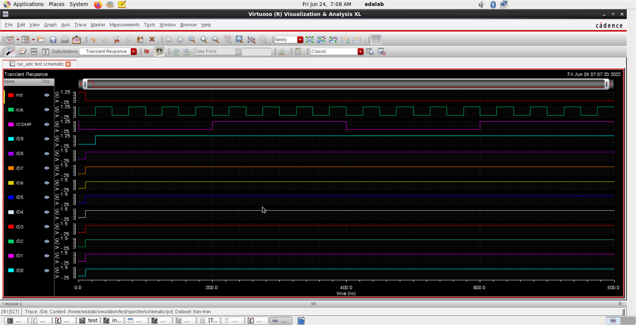 I am implementing a 10-bit sar adc using cadence. I have been stuck in the SA Register part. I am using 22 numbers of D-Flipflops. The single flip-flop circuit is functioning absolutely fine and all the 11 flip flips on the upper row in the below screenshot I have attached, are acting absolutely fine when the Q of one flip flop is connected to the D of the next flip flop. I am getting Q low and Qbar high in each flip flop of the upper row. Now when I am connecting the below flipflops and completing the register circuit, I am not getting the desired bit output, Can anyone please help me?