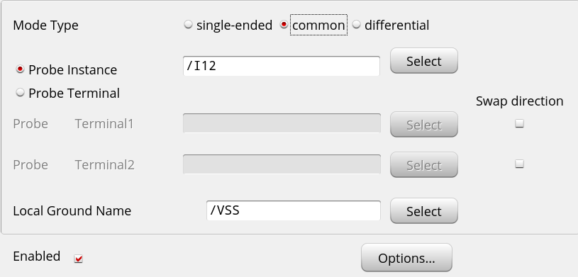 • Using diffstbprobe with the analysis mode set to "common-mode" results in a negative gain. The phase instead starts at −180° and increases toward 0°.