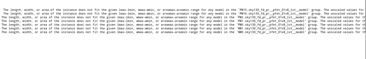 I’ve encountered an issue while running Monte Carlo mismatch simulations using the Sky130 PDK in Cadence. Even though all transistor dimensions are well within the valid limits defined by the PDK, the simulation fails and reports an error stating that the device dimensions are “out of the defined bound.”
