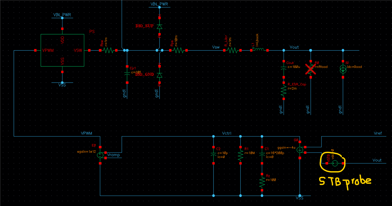 I am new to power converters. I am currently working on a controller design for buck. I wanted to simulate the stability response for the circuit. While pss is working as per expectation, pstb is giving '0' (-6.4kdB) loop gain and phase. I am using voltage source as probe at the o/p to break the circuit. Can anyone help me - what i am missing here?